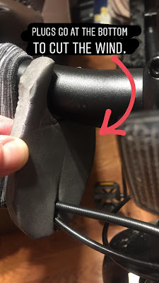 This last part is optional but makes for extra cozy mitts. I used a foam mat and cut into the shape taken up by the bar and brake lines. You don't have to do this, but then cold air comes in from the bottom and goes right into your warm hands. I just cut ovals and then held them up and cut until I got the right shape.