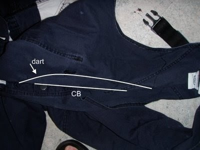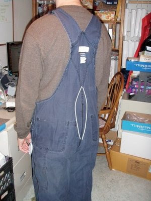 Nothing too exciting on the sewing front. My husband wears a lot of overalls when he is working on the slope. They have to be made out of flame resistant material. These are expensive overalls. When guys stop working up there, they usually give their overalls to other workers. My husband got this set from his father who also works on the slope. They were too big in the waist. With my new-found altering expertise (I'm totally kidding, btw), I had him put them on inside out and I pinched out a dart through the waist. He didn't want two darts in the back and said he preferred this. It does mess up the seam in the back but who is going to (1) be looking and (2) care. Here's the dart I chalked on. I made the mark darker in the photo-editing program so you could see it.